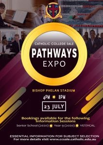 Our Pathways Expo Evening will this year take place on Tuesday 23rd July 2019 from 4.00pm – 8.00pm. The evening provides students and parents with important information to assist in making decisions on 2020 subject selection. All students and parents are required to attend the Information Session relevant to their year level in 2020 prior to going to the Pathways Expo, which will be held in Bishop Phelan Stadium.