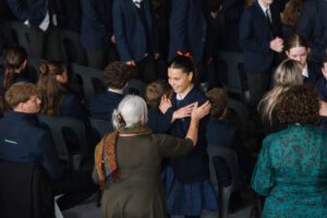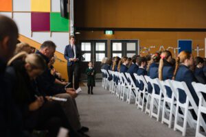 A highlight of the celebration was the Offertory Procession, led by Catholic College Sale’s tallest student alongside one of the youngest prep students, beautifully illustrating the intergenerational responsibility of building a peaceful world.