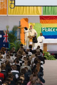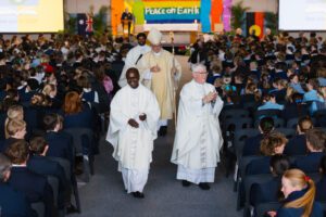Held in the Bishop Phelan Stadium, the Mass brought together school communities in a moving celebration of solidarity and faith. The event began with the traditional procession of school banners, each one a vibrant representation of identity and unity, followed by a visual display of national flags to highlight the global importance of peace.